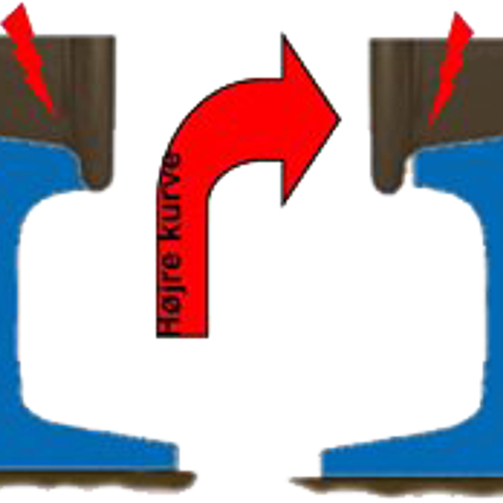 I kurver, hvor ydre skinne løber mod ydre hjuls flange. Dette giver en vedvarende knirkende tør friktion mellem hjulflange og skinneside. Friktionen giver hjul-skinne-støj og alvorligt slid på både hjulflange og skinneside.